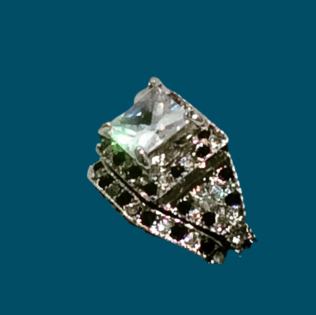 Silver plated wedding ring set! Size 8. Adorned with clear and blue cut crystals! NWOT! Three Day Money Back Guarantee! All Jewelry Is Cleaned And Polished Before Shipping!